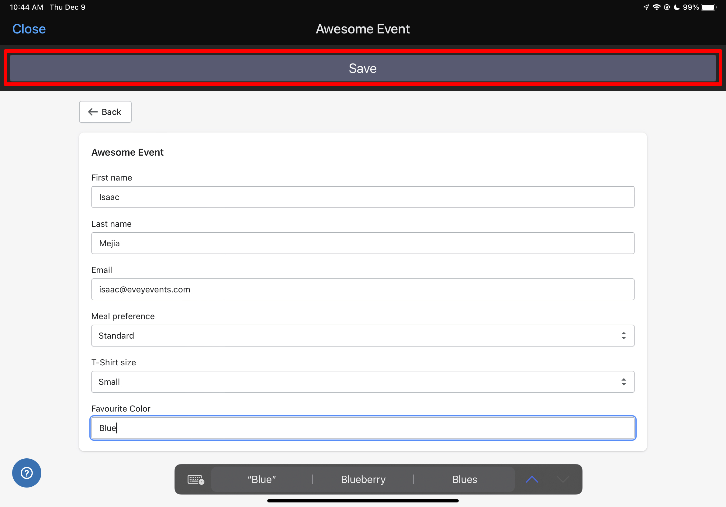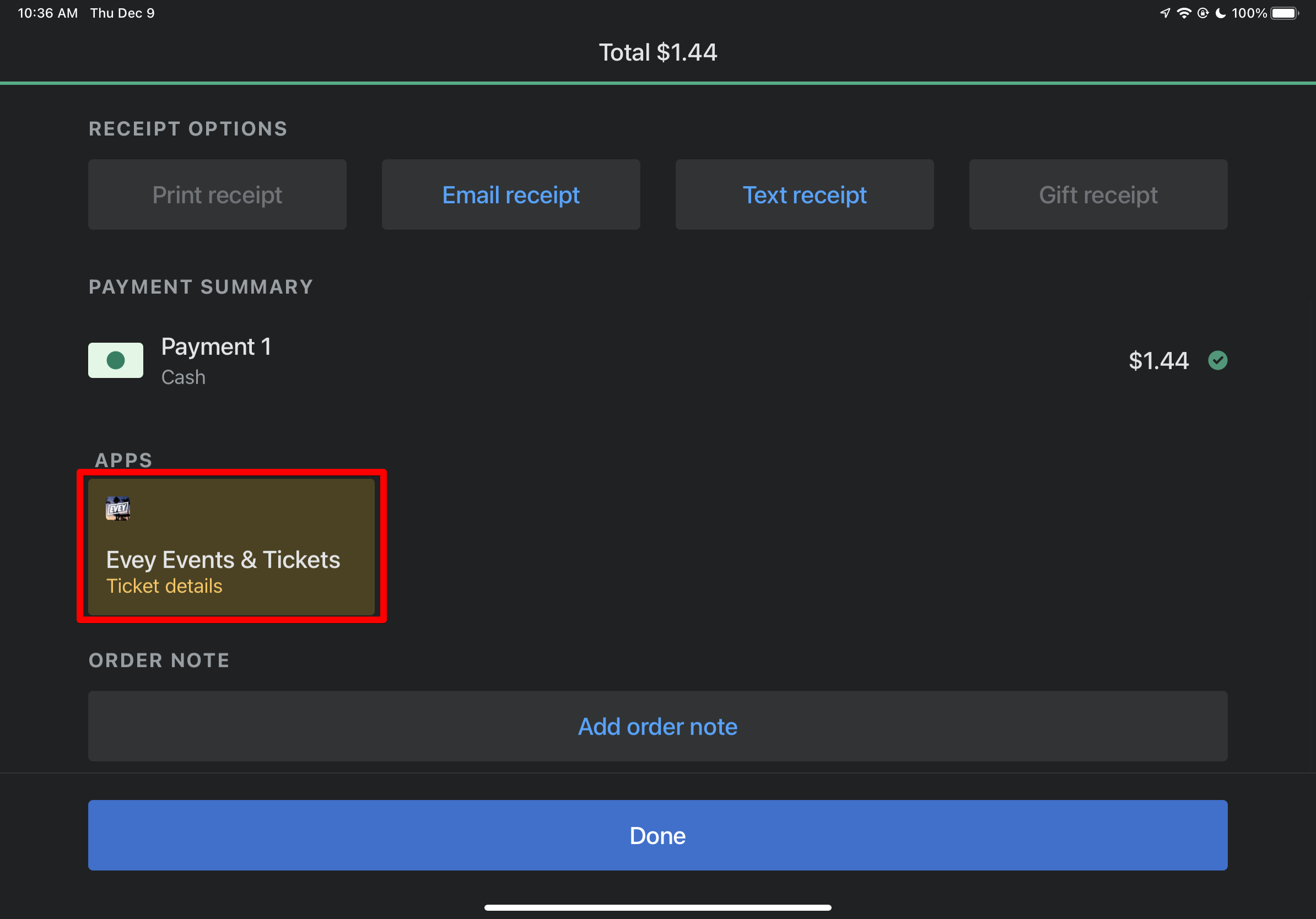 From there, you will see a tile on the POS for “Evey Events and Tickets”: this will give you the ability to provide additional details for the ticket before check-out. This is helpful for tickets that use information collection integration on your storefront, or for choosing a date/time for a recurring event. You’ll be shown all the tickets you have in the cart and can choose which ones you want to edit the information for. Once you have the information filled in, you can click save. When all the tickets are completed, you can click “Close” in the upper right hand corner which will take you back to the POS.